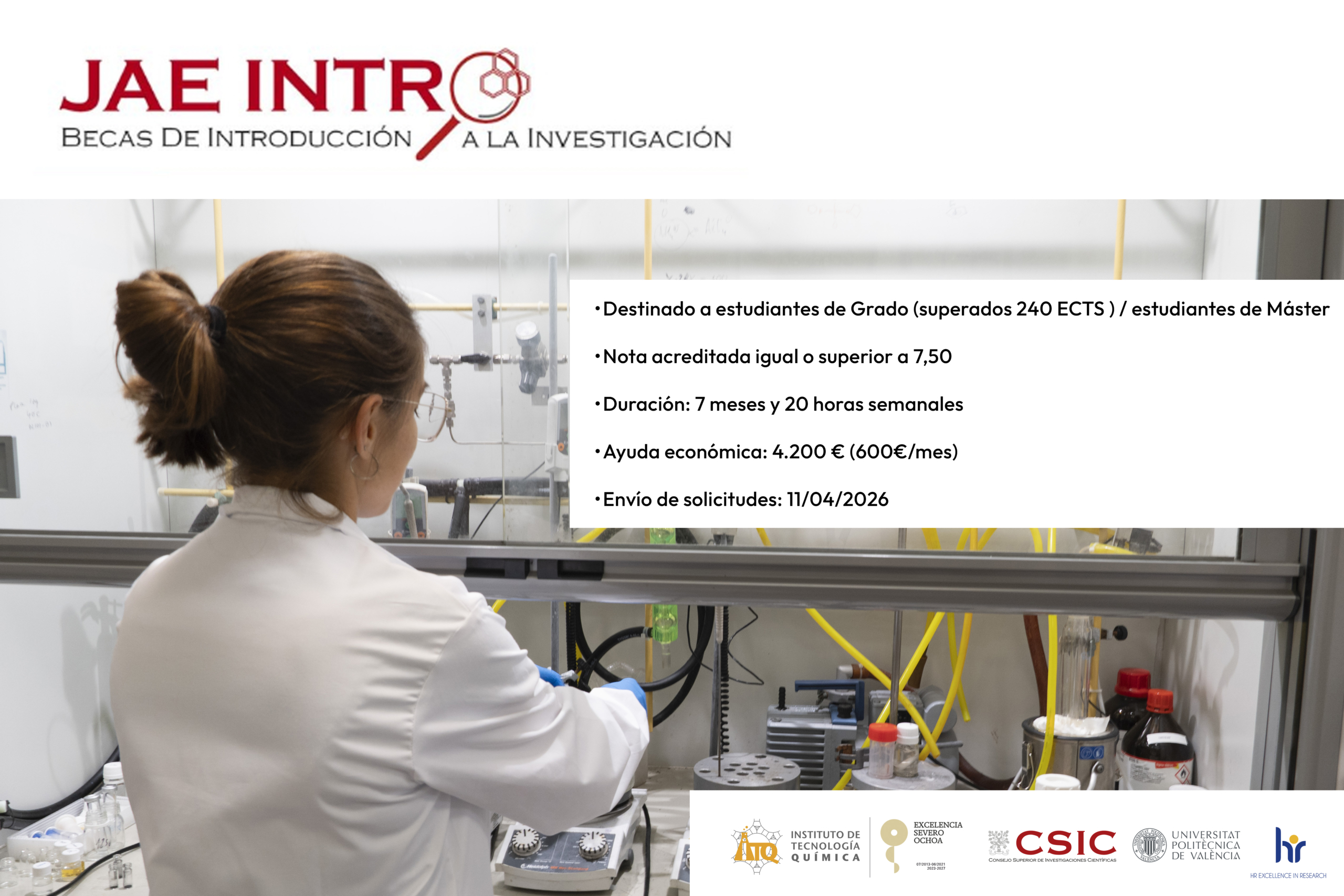 En el ITQ (CSIC-UPV) ofrecemos 9 becas formativas JAE Intro, convocadas por el CSIC, para que el alumnado interesado pueda conocer las diferentes ramas científicas que se desarrollan en el ITQ (CSIC-UPV).
