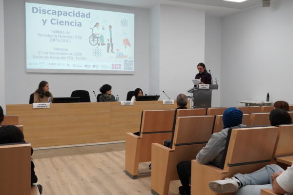 El pasado viernes realizamos la jornada «Discapacidad y ciencia» en el ITQ (UPV-CSIC). La jornada, coorganizada por la comisión de igualdad y de divulgación del ITQ y enmarcada en la Semana de la Ciencia, tuvo como objetivo visibilizar las experiencias, los logros y los desafíos que enfrentan las personas con discapacidad en el ámbito científico.